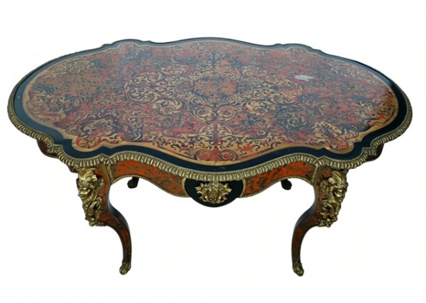 • França, séc. XIX. Linda mesa estilo BOULLE. ESTILO E ÉPOCA IMPÉRIO FRANCÊS. Mesa de apresentação com rico trabalho em tartaruga e aplicações em BRONZE em rico trabalho de cinzel. Todo o conjunto com banho de ouro mercúrio (ORMULU). Possui tampo oblongo de contornos irregulares com magistral trabalho em marchetaria em bronze também a banho de ouro mercúrio. Apoia-se sobre quatro pernas recurvas que apresentam quatro fantásticas representações de bustos de figuras femininas no mais rico trabalho de cinzel. Apresenta uma gaveta. Medidas aprox. 77 cm de altura, 155 cm de comprimento e 93 cm de profundidade.