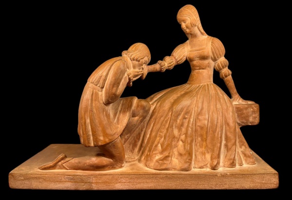 • D.H. CHIPARUS França. Linda e delicada escultura em terracota em estilo e época ART DECO representando casal em cena de galanteio. Apresenta-se assinada e marca. Apresenta pequeno restauro na base bem imperceptível. Medidas aprox. 35 cm de altura, 47 cm de comprimento e 17 cm de largura.