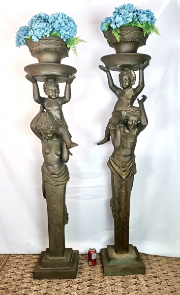 • EUROPA Séc. XIX/XX. Lindíssimo PAR DE ESCULTURAS em BRONZE. Casal em forma de cariátides e cada um com uma criança nos ombros e arrematando vaso floreira na parte superior. Peças muito decorativas tanto para interior quanto exterior. Apresentam diferença de altura em função da fundição a mão. Medidas aprox. 170 cm de altura cada.