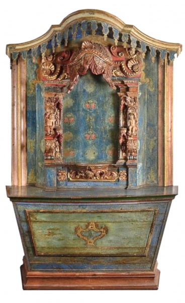 • Brasil, séc. XVII-XIX. Monumental e muito raro ALTAR BARROCO de altíssima qualidade e rica policromia nas tonalidades ocre e azul. Apresenta ainda rica pintura com motivos fitomórficos na parte interna, gracioso e muito rico baldaquim com lindo panejamento, colunas ladeando o nicho propriamente dito com representação de graciosos anjos magnificamente esculpidos. O conjunto é formado por volutas e concheados características do período e fechando o conjunto magnífica mesa de celebração com rica policromia e florão ao centro. Medidas aprox. 285 cm de altura, 190 cm de largura e 45 cm de profundidade.
