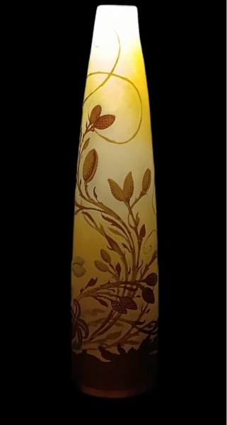 • ÉMILE GALLÉ. França Séc. XIX/XX. Lindo vaso em vidro camafeu, com fundo âmbar e sobreposição em tom castanho. Técnica Cameo Glass, autêntico e de época. Maravilhoso trabalho em relevo com motivo vegetalista de ramos e folhagens sinuosas. Assinado. Medidas aprox. 38 cm.