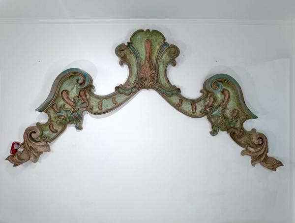 • Brasil Séc XVIII. MINAS GERAIS. Monumental e muito lindo FLORÃO construído em madeira nobre e de excepcional qualidade. Maravilhoso  trabalho de cinzel que nos remete ao melhor do período BARROCO. Apresenta riquíssima policromia de época em tons predominantemente verde, azul e carmim. Rara de encontrar nessas dimensões e em tão bom estado de conservação em função de sua extensa antiguidade. Item de coleção extremamente elegante e raro. Peça já analisada pelo IPHAN. Medidas aprox. 150 cm de altura, 275 cm de largura e 30 cm de profundidade máxima.