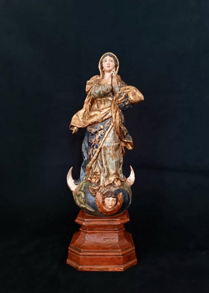 • Brasil Séc. XVIII. Minas Gerais. Belíssima e muito rara imagem de NOSSA SRA. DA CONCEIÇÃO de altíssima qualidade. Apresenta rico panejamento, profusão de acabamentos à ouro. Essa graciosa imagem apresenta-se de mãos postas em atitude de devoção e oração. Apresenta-se apoiada em nuvens estilizadas na cor azul com linda representação de anjo e o crescente lunar. A base foi anexada posteriormente que só enriquece e da grande leveza ao conjunto. A imagem não apresenta coroa ou resplendor. Item de coleção e em muito bom estado de conservação. Medidas aprox. 40 cm altura total.