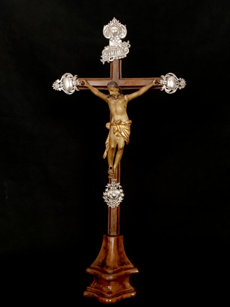 • Brasil Séc. XVIII. Muito lindo e rico CRUCIFIXO com representação de NOSSO SENHOR JESUS CRISTO de excepcional qualidade e riqueza de detalhes. Apresenta magníficos apliques em PRATA batida, repuxada e cinzelada. Item de extrema qualidade, apresenta ainda nas costas de NOSSO SENHOR JESUS CRISTO marcas dos flagelos recebidos no calvário. Item de coleção. Medidas aprox. 58 x 28 cm.