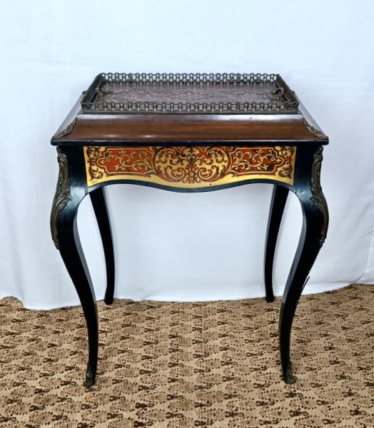 • França Séc. XIX. Charmosa MESA FLOREIRA BOULLE. Apresenta rico trabalho em marcheterie com apliques de tartaruga. Bandeja removível com pegas em bronze e circulada por bela galeria em bronze trabalhado. Apoia-se sobre quatro pernas curvas com apliques em bronze e finalizando com acabamento também em bronze nos pés. Medida da abertura aprox. 45 x 30 cm. Medidas da mesa aprox. 76 cm de altura, 63 cm de comprimento e 46 cm de largura. Item extremamente chic e decorativo.