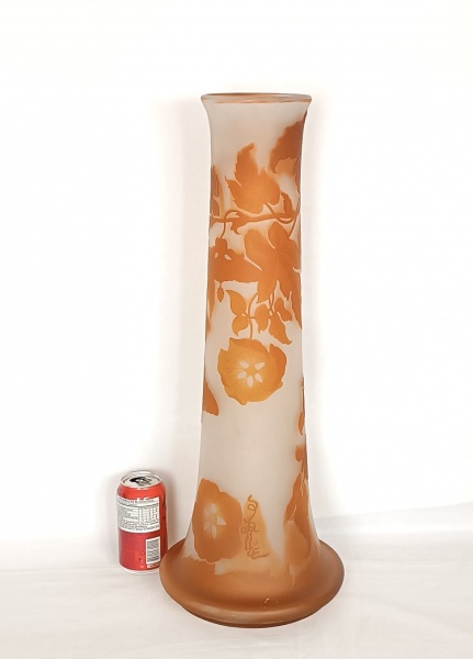 • EMILE GALLÈ. França Séc. XIX/XX. Lindíssimo vaso de rara beleza na técnica CAMEO GLASS com sua decoração no tom alaranjado. Peça lindíssima dita `Pata de Elefante`. Assinado. Peça difícil encontrar nessas medidas e em tão bom estado de conservação. Se Medidas aprox. 60 cm de altura e sua base 22 cm de diâmetro.
