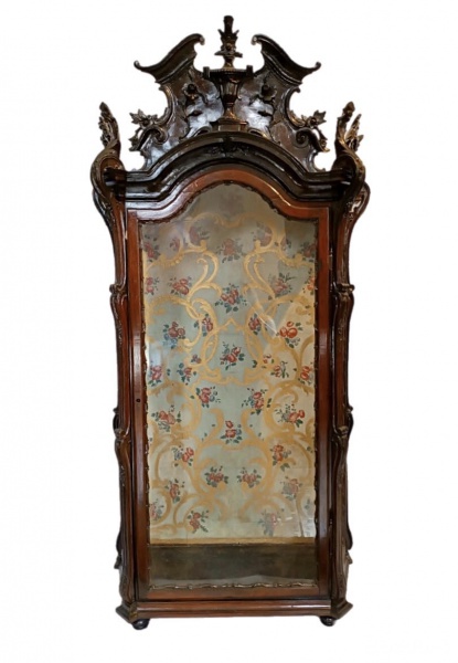 • Brasil Séc. XVIII. RIO DE JANEIRO. Excepcional e muito importante ORATÓRIO estilo e época D. JOSÉ I (aprox. 1750-1777), auge do BARROCO BRASILEIRO. Peça de grandes dimensões construído em JACARANDÁ ricamente entalhado com magníficos vazados dando grande leveza ao conjunto. Laterais e frente envidraçados. Apresenta estupenda decoração com magnífica pintura de alta qualidade na parte interna com rica aplicação a OURO e linda pintura com motivos florais. Apresenta em seu teto rara e muito importante pintura com representação do DIVINO ESPÍRITO SANTO na parte central rodeado por nuvens estilizadas e rara representação do sol e da lua com faces humanoides. Apresenta-se reproduzido no livro `Mobiliário` Vol. II Freire, Fernanda Castro - Fundação Ricardo do Espírito Santo Silva 2001 pag. 148 (não possui o livro).  Raríssimo item de coleção com altíssimo VALOR MUSEOLÓGICO. OBRA JÁ ANALISADA PELO IPHAN. Medidas aprox. 162 cm de altura, 88 cm de largura e 38 cm de profundidade.