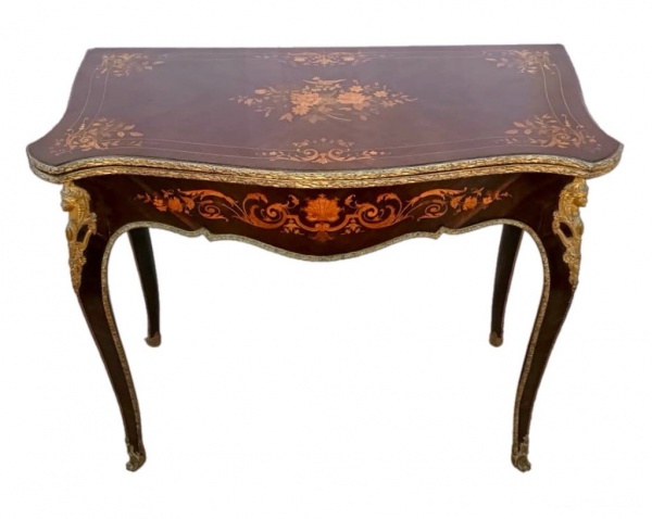 • França Séc. XIX. Lindo CONSOLE reversível para MESA DE JOGO em madeira nobre e rica bronzeria. Apresenta fino trabalho de marcheterie. Necessita restauro no forro da mesa de jogo. Medidas aprox. 78 cm de altura, fechada: 91 cm de largura e 46 cm de profundidade e aberta 88 cm de largura e 91 cm de profundidade.