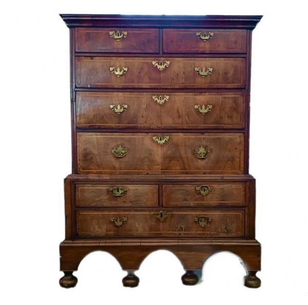 • Inglaterra Séc. XVIII. Circa 1710. Belíssima e rara cômoda alta `Queen Anne`, ou cômoda dupla inglesa em madeira nobre. Móvel adquirido no leilão da Christies, European Works of Art, Decorative Objects, Carpets and Furniture, realizado em 4 de fevereiro de 1998. Apresenta variados tamanhos de gavetas em marqueterie filetadas formando um conjunto maravilhoso. Possui sua base em larga saia recortada em grandes arcos arrematados em pés de bolacha. Apresenta ainda seus puxadores e frentes de chave em bronze de alta qualidade. Peça em muito bom estado de conservação em função de sua extensa antiguidade. Item muito raro de encontrar no Brasil. Acompanha catálogo. Medidas aprox. 140 cm de altura, 100 cm de largura e 52 cm de profundidade.