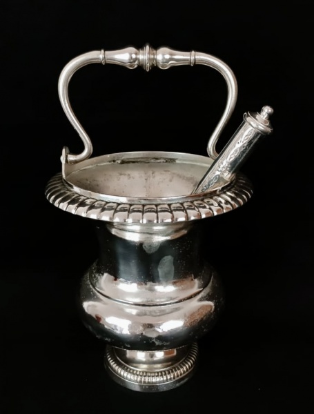 • Brasil Séc. XIX. Linda CALDEIRINHA com seu HISSOPE espessurada a prata. Apresenta corpo bojudo e liso, borda trabalhada em godrons. Peça imponente. Medidas aprox. 37 cm de altura total, hissope 31 cm de comprimento.