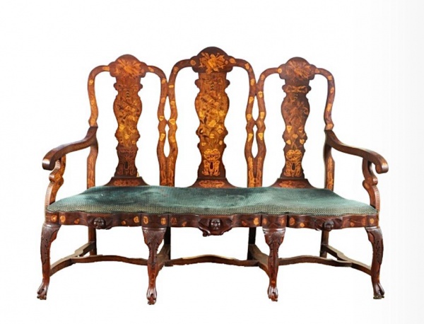 • Lindo CADEIRAL holandês em mogno com rica marchetaria floral, tabelas sinuosas decoradas com elementos florais e troféus musicais. Móvel adquirido no leilão da Christies, European Works of Art, Decorative Objects, Carpets and Furniture, realizado em 4 de fevereiro de 1998. Medidas aprox. 112 cm de altura, 159 cm de largura e 65 cm de profundidade.