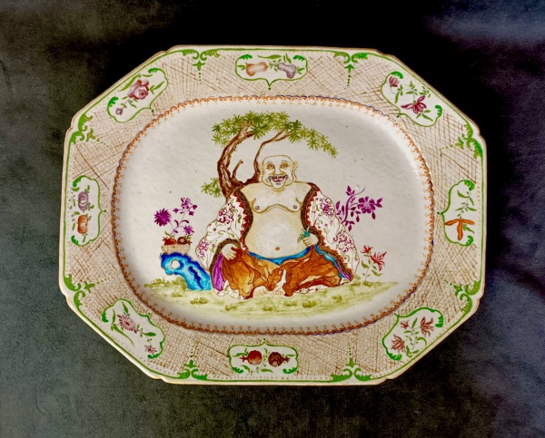 • Cia das Índias Séc XVIII. Excepcional e raríssima travessa em porcelana chinesa com esmaltes Família Rosa de excepcional qualidade. Apresenta rico trabalho realçado à ouro com monumental e rara representação BUDDHA DA FELICIDADE ricamente trajado e sentado em gracioso jardim. Rara paleta de cores. Apresenta em seu verso vestígios de etiquetas e marcação número 51, coleção ARI BRAGANÇA DE BOURBON. Item muito raro para coleção. Medidas aprox. 42 x 23 cm.