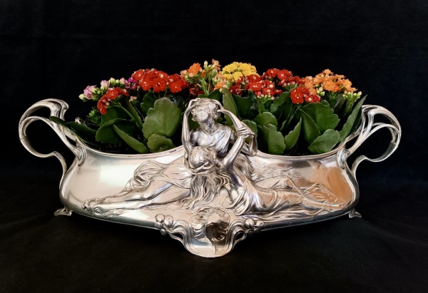 • WMF. Alemanha meados Séc. XX. Maravilhosa e rara floreira em metal prateado espessurado a prata. Apresenta linda cena romântica na parte da frente. Possui seu recipiente original. Linda peça, muito decorativa. Medidas aprox. 57 cm de comprimento,  28 de largura e 17 cm de altura.