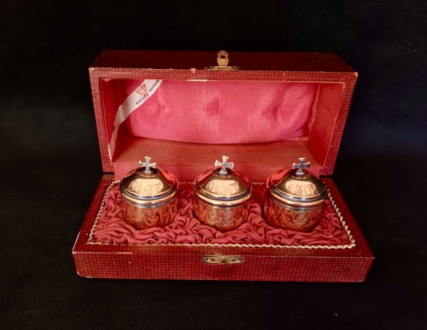 • SANTOS ÓLEOS. Importante e raro conjunto completo composto pelos seus três recipientes originais em PRATA com VERMEIL e acondicionados em seu estojo original. Recipientes para os óleos sagrados que compõem a liturgia. Lindo conjunto. Apresenta suas marcações, encimados por cruz e apresenta ainda marcação do teor da prata na base dos mesmos. Produzido pela EBERLE meados do Séc. XX. Medidas aprox. Caixa: 6 cm de altura, 15,5 cm de largura e 7 cm de profundidade; cada recipiente 5,5 cm de altura e 3 cm de diâmetro.
