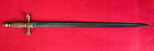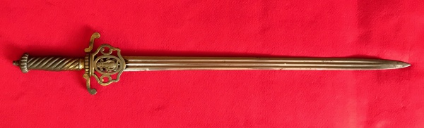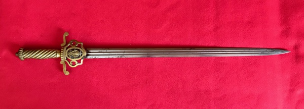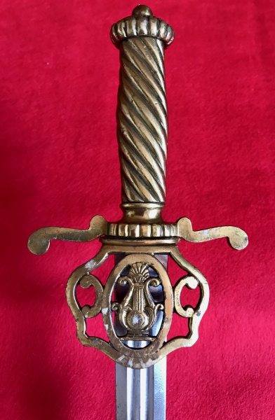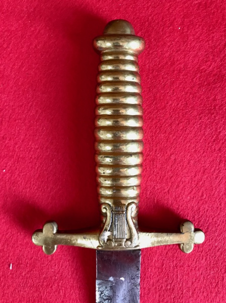 • Império Brasileiro. Espada de músico. Apresenta punho em latão com símbolo de harpa no próprio punho, não possui guarda. Medidas aprox.: total 64 cm, lâmina 52 cm.