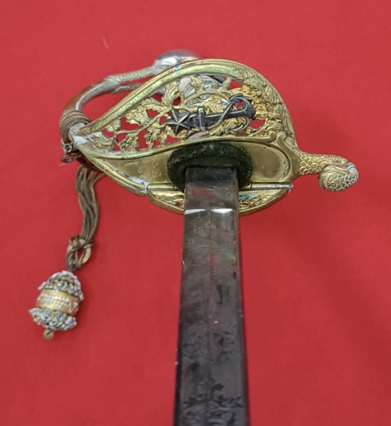 • Portugal. Rica espada com sua bainha original portando Brasão do Império Português. A lâmina apresenta inscrição na parte superior `Jorge & Santos Lisboa`. Apresenta sua pega em bronze com rico trabalho de entalhe encimada por leão estilizado e seu punho em madeira. Apresenta ainda seu barrete cerimonial de época. Linda e colecionável peça. Medidas aprox.: total 99 cm, lâmina 85 cm e bainha 87 cm.