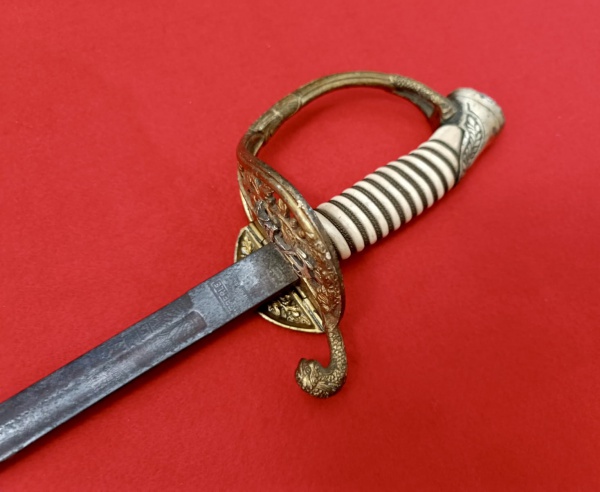 • Brasil inicio séc. XX. Antiga espada com seu punho em marfim com seu pomo todo trabalhado e com Emblema da Marinha do Brasil, guarda com emblema da marinha, apresenta dobradiça e acessório com lindo pingente trabalhado. Apresenta lâmina reta com desenhos e inscrições. No ricaço da lâmina apresenta marca `AEC` dentro de triângulo. Medidas aprox.: total 100 cm, lâmina 84 cm.