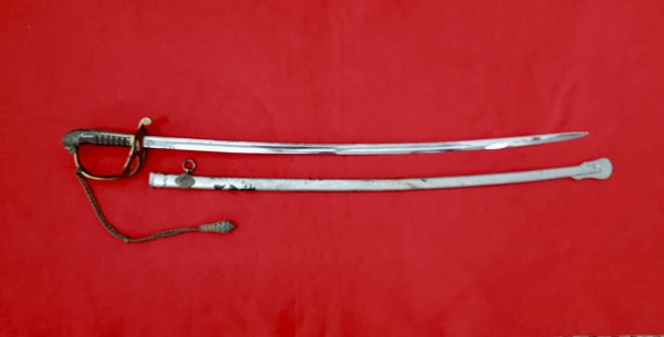 • Império Brasileiro. Espada com sua bainha, na sua guarda inscrição PII e canhões cruzados abaixo. Seu punho foi trocado posteriormente, porém de baixa qualidade. Apresenta sua bainha original. No ricaço da lâmina apresenta marca Gebruder Weyersberg Solingen. Medidas aprox.: total 94 cm, lâmina 79 cm e bainha 82 cm.