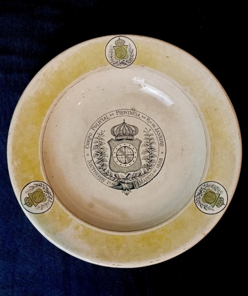 • Casa Imperial Brasileira. Corpo Policial do Rio de Janeiro. Prato fundo de louça com três reservas circulares com Brasão Imperial ao centro, circundado por uma jarreteira com a legenda `Corpo Policial da Província do Rio de Janeiro - Niterói 1º de março de 1888`. Reproduzido à página 228 do livro `Louça da Aristocracia no Brasil`, por Jenny Dreyfus, e à página 521 da obra `O Brasil e a Cerâmica Antiga`, de Eldino da Fonseca Brancante. No reverso, marca Anthony Shaw & Sons. Reproduzido em catálogo de grande LEILÃO IMPERIAL 200 ANOS - Escritório de Arte Miguel Salles ocorrido em São Paulo nas datas 20, 21 e 22 de Setembro de 2022. Aprox. 24 cm.