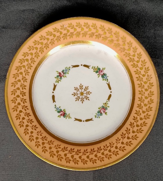 • Casa Imperial Brasileira. Louça da Casa Reinante. D. Leopoldina. Muito raro prato que atribuímos tratar-se de exemplar acessório do serviço de porcelana de D. Leopoldina. De acordo com Jenny Dreyfus, trata-se de porcelana de Paris, da manufatura de Mme. La Duchesse d`Angoulême, no Boulevard Poissonnière. Pasta dura. Século XIX. Embora nenhum prato conhecido deste serviço apresente marca (como o presente exemplar), graças a uma fruteira conservada no Museu Histórico Nacional foi possível identificar a manufatura que o produziu. Exemplar do serviço está reproduzido no livro O Brasil e a Cerâmica Antiga, de Eldino da Fonseca Brancante, na página 600, figura 565. Reproduzido em catálogo de grande LEILÃO IMPERIAL 200 ANOS - Escritório de Arte Miguel Salles ocorrido em São Paulo nas datas 20, 21 e 22 de Setembro de 2022. Aprox. 22 cm.