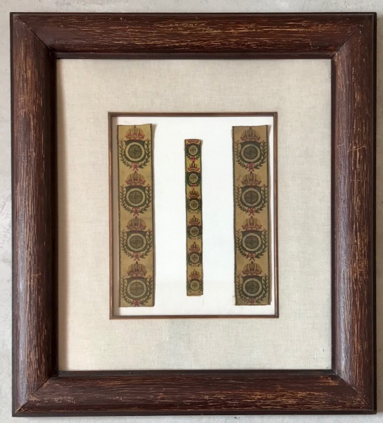 • FAMÍLIA IMPERIAL BRASILEIRA. Brasil PRIMEIRO IMPÉRIO. O brasão apresenta ainda globo armilar com uma única faixa transversal. Conjunto autentico de época. Galões bordados com Brasão Imperial, raros de se encontrar, que guarneciam casaca do uniforme de grupo de elite das forças imperiais da época. Guarneciam os uniformes dos Arqueiros Imperiais. GUARDA IMPERIAL DOS ARQUEIROS foi a guarda cerimonial dos imperadores brasileiros desde o estabelecimento do Império em 1922 até o final em 1889. A guarda foi modelada segundo a Guarda Real Portuguesa dos Archeiros. Esse grupo de elite era a proteção do monarca e familiares, inclusive acompanharam D. João VI na vinda ao Brasil. Em 1822 D. Pedro I, inspirado na Guarda Real Portuguesa criou a Guarda imperial do Arqueiros. Medidas dos fragmentos da esquerda para a direita 28 x 6 cm; 24 x 3 cm e 28 x 6 cm. Medida total da obra 73 x 56 cm.