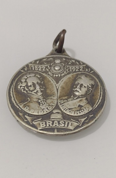 • Brasil. Muito rara e linda medalha comemorativa do Centenário da Independência D. Pedro I e Epitácio Pessoa. Apresenta na sua parte de trás imagem do Grito do Ipiranga Independência ou Morte pesando 13 g. Reproduzida catálogo LEILÃO IMPERIAL 200 ANOS -Escritório de Arte Miguel Salles
