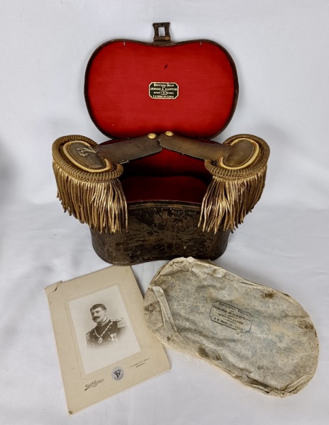 • Par de dragonas em tecido bordado, sendo a parte frontal em metal dourado com franjas em canutilhos dourados e botões com âncora encimada por Coroa Real. Acondicionado em caixa própria em metal. Pertenceu ao Exmo. Senhor Frederico Pinheiro chagas, Oficial da Armada Portuguesa, acompanha foto. Medidas aprox. de cada dragona 10 cm de altura, 17 cm de comprimento e 13 cm de largura, a caixa 17 cm de altura, 25 cm de comprimento e 16 cm de largura.