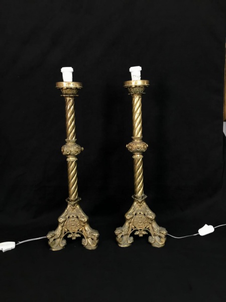 • Par tocheiros em bronze com BRASÃO IMPERIAL. Apresentam base tripoide com trabalhos em relevo e coluna retorcida. Medidas aprox. 63 cm e altura.