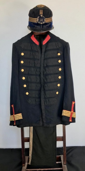 • Raro Uniforme da Guarda Nacional do Brasil do séc. XIX. Completo, composto por gandola com seus botões dourados com a Esfera Amilar do Império,  calça e quepe com o Brasão de Armas do regimento.